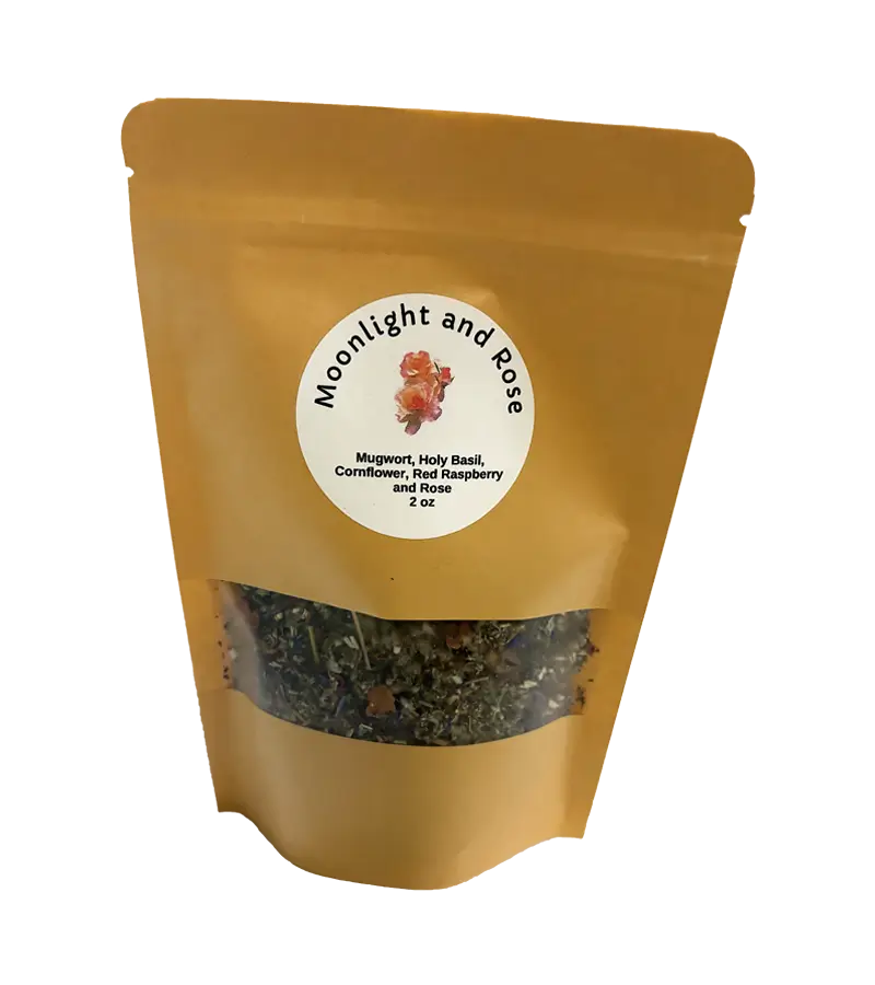 Settle into tranquility with the Moonlight and Rose herbal tea, an organic loose-leaf blend. Ingredients: cornflower, holy basil, mugwort, red raspberry, and rose.
