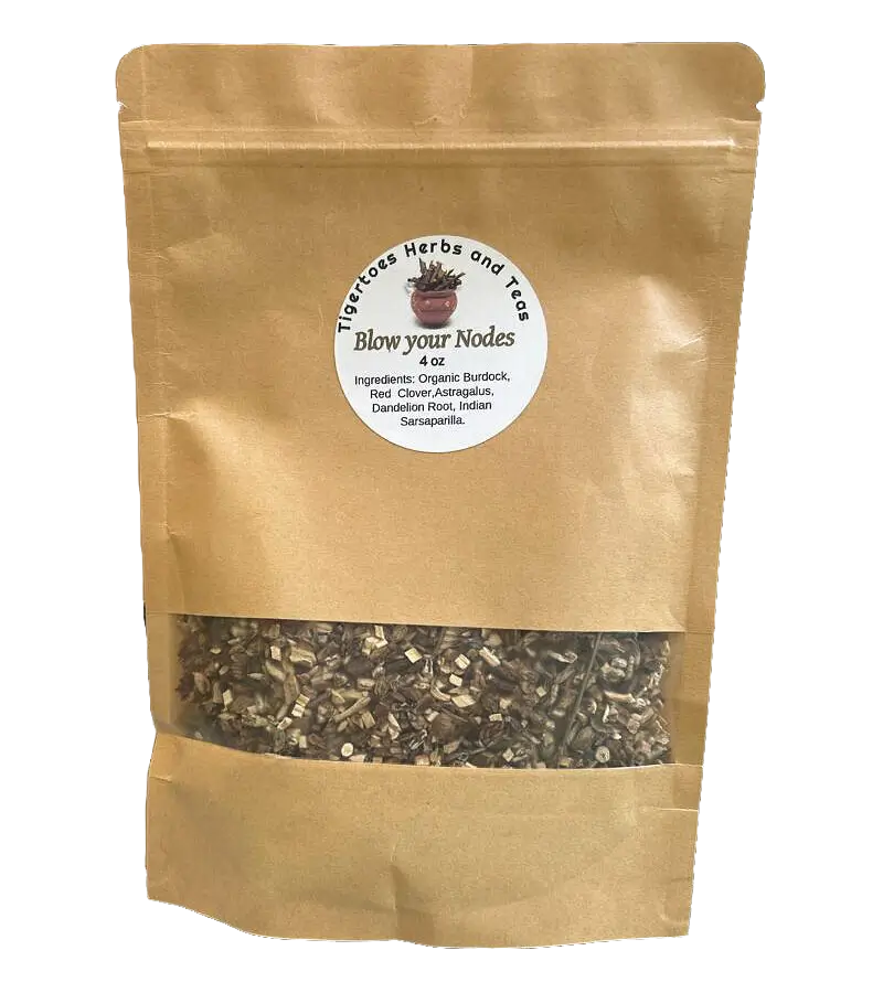 Blow Your Nodes Tea is a soothing blend of cleansing, organic burdock root, red clover, astragalus root, dandelion root, and Indian sarsaparilla. This herbal tea blend is one to keep in the cupboard.