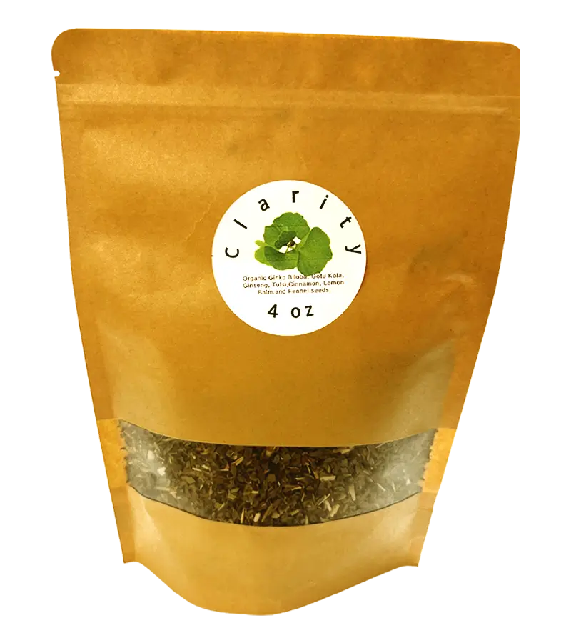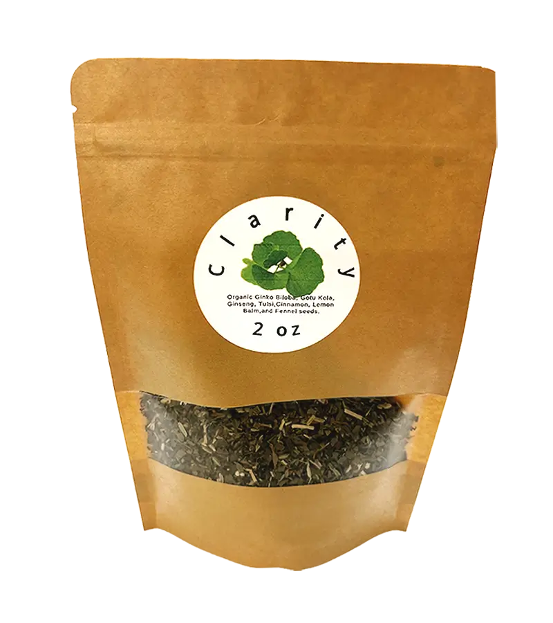 Sip the earthy Clarity Tea and clear your mind. Ingredients: cinnamon, fennel seeds, ginseng, gotu kola, lemon balm, organic gingko biloba, and tulsi.