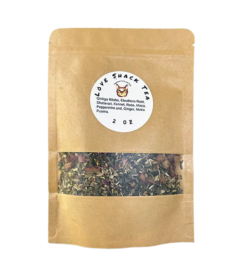 Love Shack Tea Ingredients: Gingo Biloba, Eleuthero Root, Shatavari, Fennel, Rose, Maca, Peppermint, Ginger, Muira Puama.