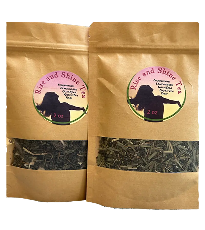 Get your morning off to an energetic start with the Rise and Shine Tea. It’s an herbal tea blend of gunpowder green tea, gotu kola, lemongrass, and tulsi.