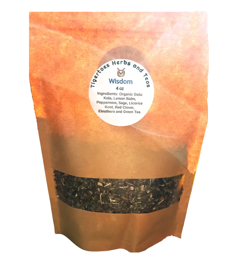 Tap into your innate intellect with the Wisdom Tea, blended with love at Tigertoes Farm in Fort Myers, Florida. Ingredients: eleuthero, green tea, lemon balm, licorice root, organic gotu kola, peppermint, red clover, and sage.
